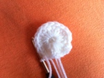 1) 5 Luftmaschen, dann jeweils 4 einfache Büschelmaschen und je 1 Luftmasche in 1 Masche häkeln, so dass man auf insgesamt 20 einzelne dünne Büschelmaschen kommt – Runde mit einer Kettmasche schließen und einen langen Faden stehen lassen.