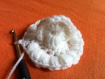 9) Nun eine Runde komplett mit der zweiten Farbe Büschelmaschen häkeln.