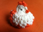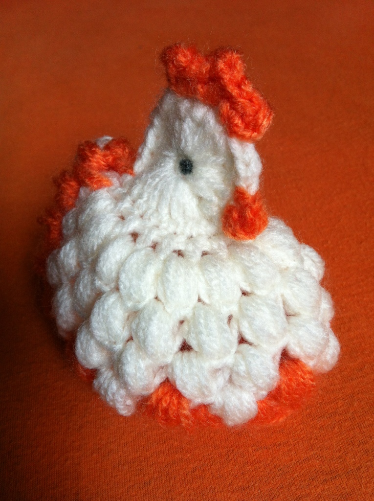 Die Augen per Hand mit dunklem Garn nähen und für den Schnabel und Kamm feste Maschen mit Luftmaschenbögen aus zwei bis drei Maschen setzen.