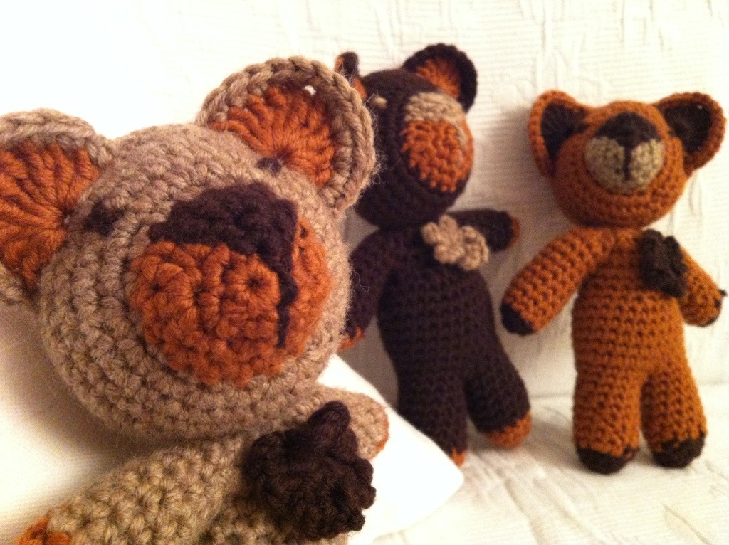 Bei meinen drei Häkelbären – wie ich jetzt gelernt habe, auch „amigorumi“ genannt – habe ich die einfache Teddybär- (Teil1, Teil2) und die Katzenanleitung miteinander kombiniert, weil mir bei den Katzen die Beinchen besser gefallen haben.