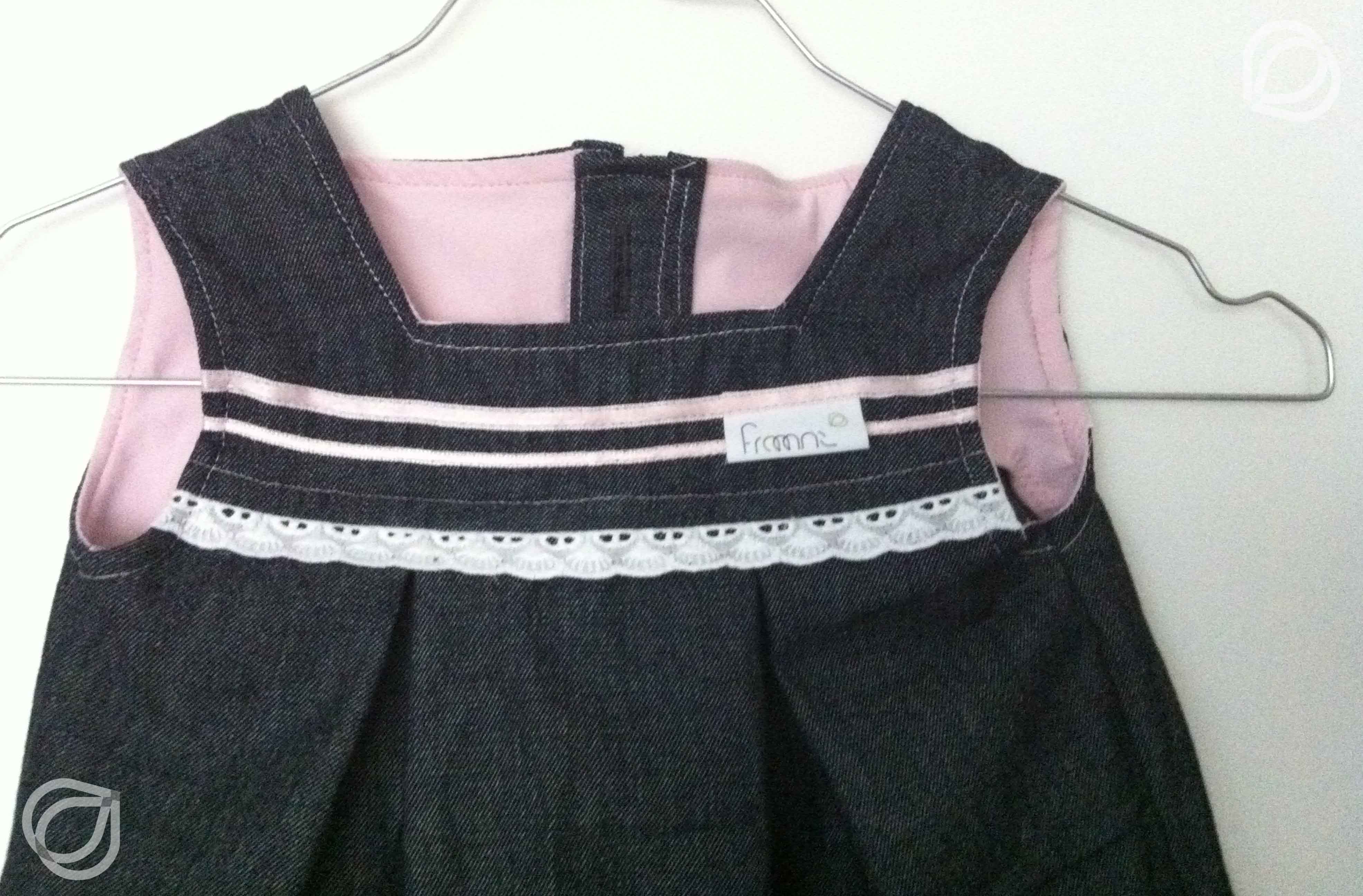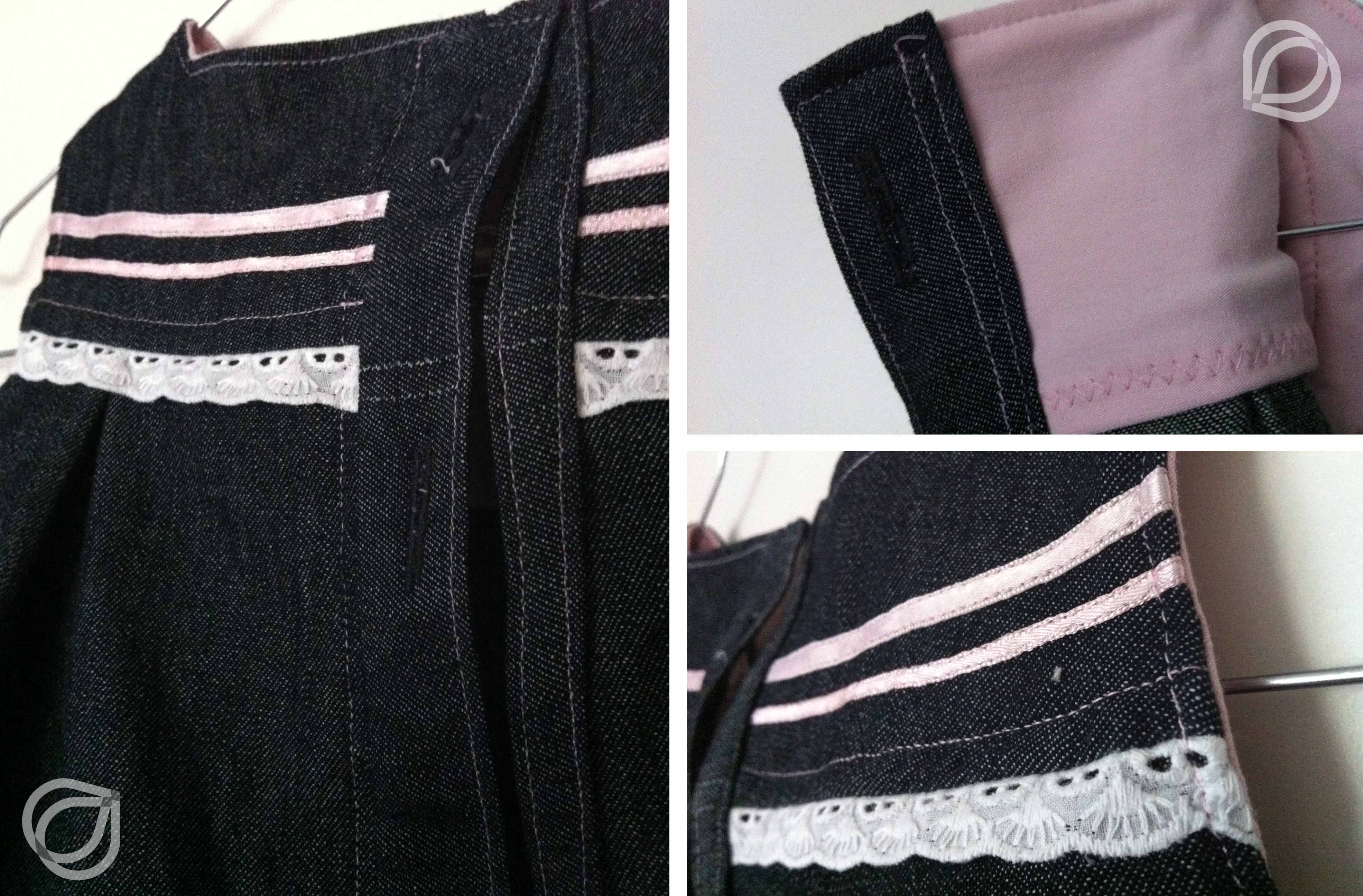 Ich hab mich für den Schnitt ganz rechts entschieden. Ein Kleidchen mit dickeren Trägern sowie Kellerfalten vorn und hinten. Für Außen habe ich einen ganz leichten Jeansstoff genommen. Quasi Upcycling eines alten langen Jeansrocks. Als Kontrastfarbe habe ich dann ganz Mädchen-typisch rosa gewählt. Rosa (Stepp-)Nähte, rosa Innenfutter und rosa Zierbänder. Ich finde die Kombination einfach toll.