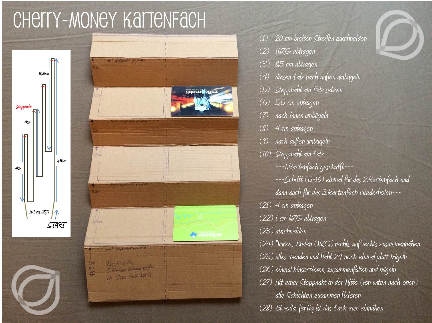 Beim Nachnähen hat es Jenny wohl gemerkt, mein selbst gebasteltes Erstlingswerk den Cherry-Money mit passendem Kartenfach hat noch hier und da kleine Kinderkrankheiten. Drum hab ich ein mal kurz nochmal nachgelegt und mir eine Schablone angefertigt.