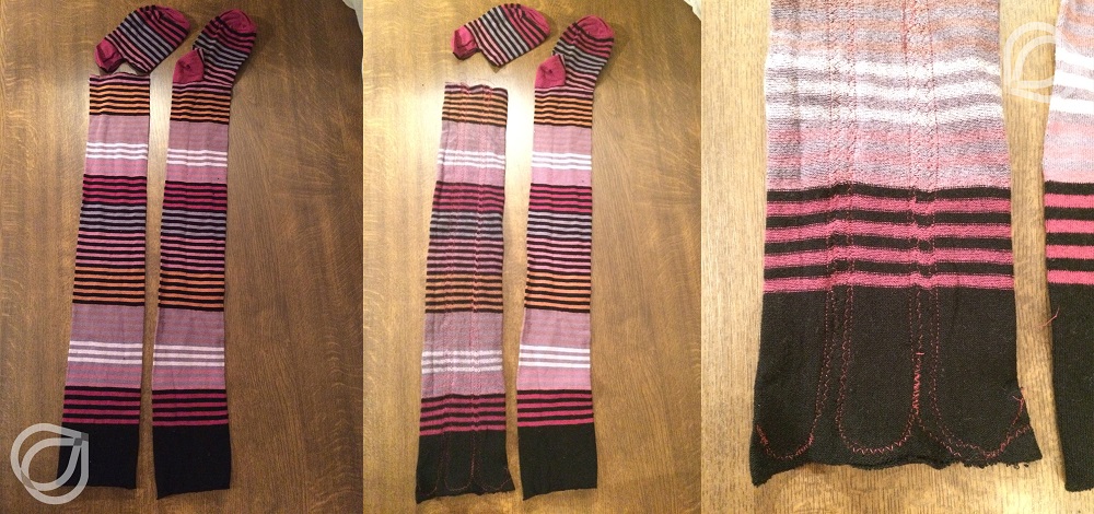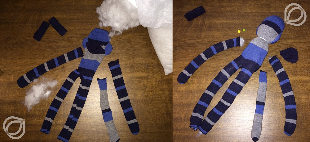 Für die Beine nehmt ihr nun die andere Socke und dreht sie auf links. Ihr setzt Steppnähte und Zickzacknähte wie bei den Armen, nur das Ihr die Socke in 2 Teile einnäht und an der Verse (der zukünftige Po) stoppt, eine 180-Grad-Kurve näht und dann direkt das andere Bein formt. Kurz oberhalb des „Schritts“ kann man nun ein kleines Loch machen, um die ganzen Socke wieder zu wenden und dadurch mit Füllmaterial zu stopfen.