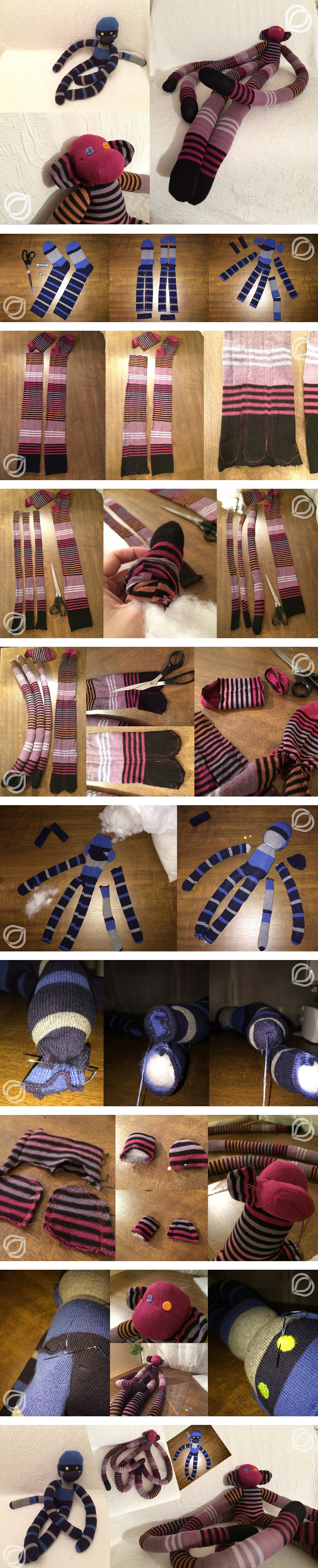 Am Besten eignen sich lange Kniestrümpfe. Hier passt das Verhältnis aus Körper, Kopf und Beinen meiner Meinung nach am schönsten (in meinen Bildern der blau-gestreifte Affe). Nimmt man normale Socken, bekommt der Affe entsprechend kürzere Beine. Bei einer Strumpfhose können die Beine überdimensional lang werden – wie man es bei meinem pinken Sockenaffen sehen kann.