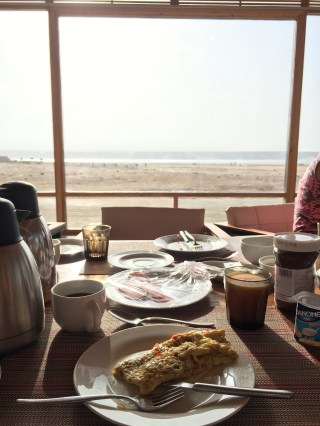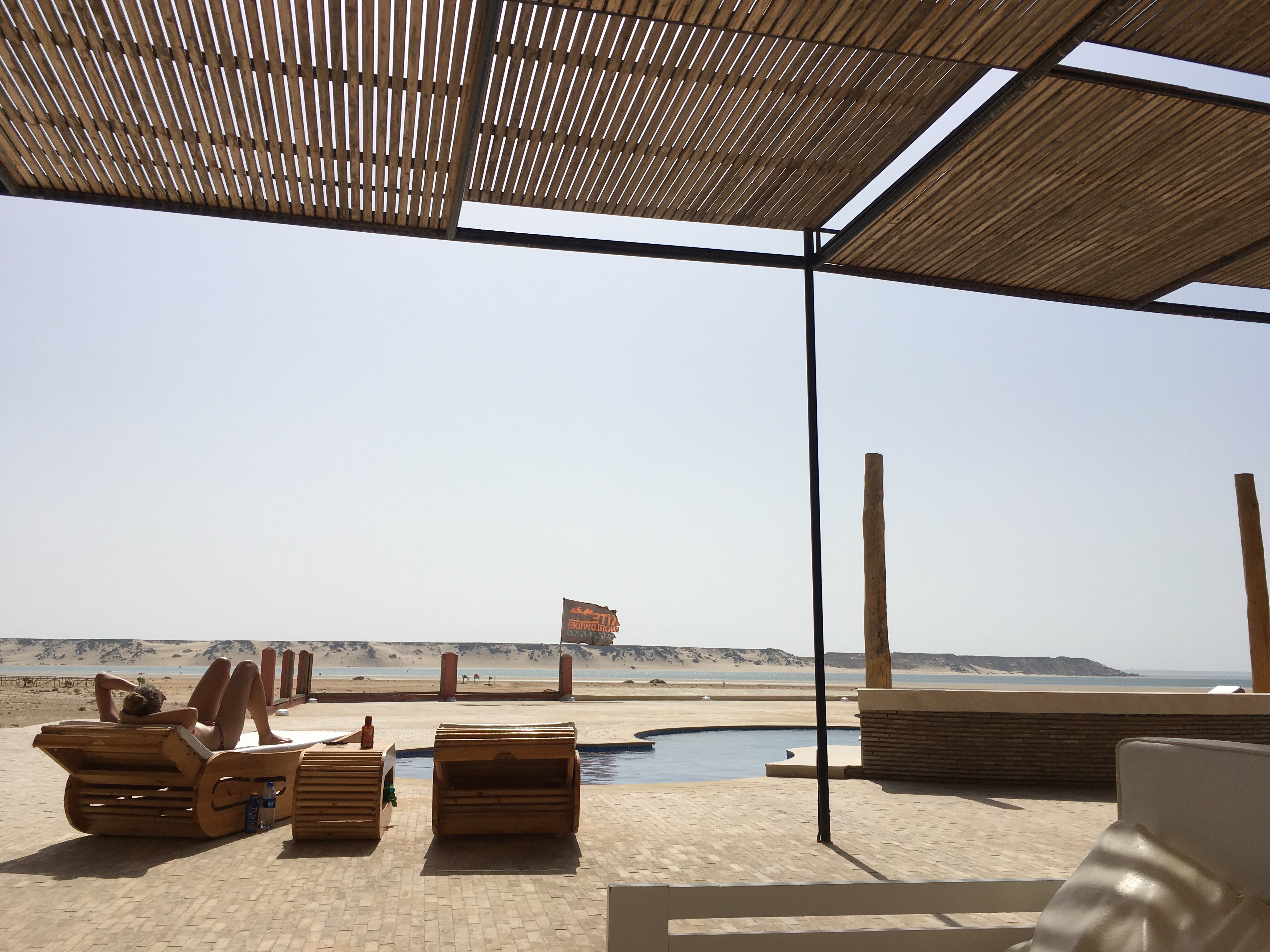 Nach ausgiebigem Ausschlafen (Dank 1h Zeitverschiebung noch länger 😉) sehe ich nun zum ersten Mal bei schönstem Licht, wo ich eigentlich gestrandet bin: eine tolle kleine Anlage mit reichlich Loungemöbeln draußen, kleinem aber feinem Pool mit komfortablen Relaxliegen und einem Wahnsinnsblick auf die riesige Lagune und karke Dünenlandschaft. Ohne Bäume und alles in warmen Gelbtönen. Ich bin wie hypnotisiert und staune erstmal vor mich hin.