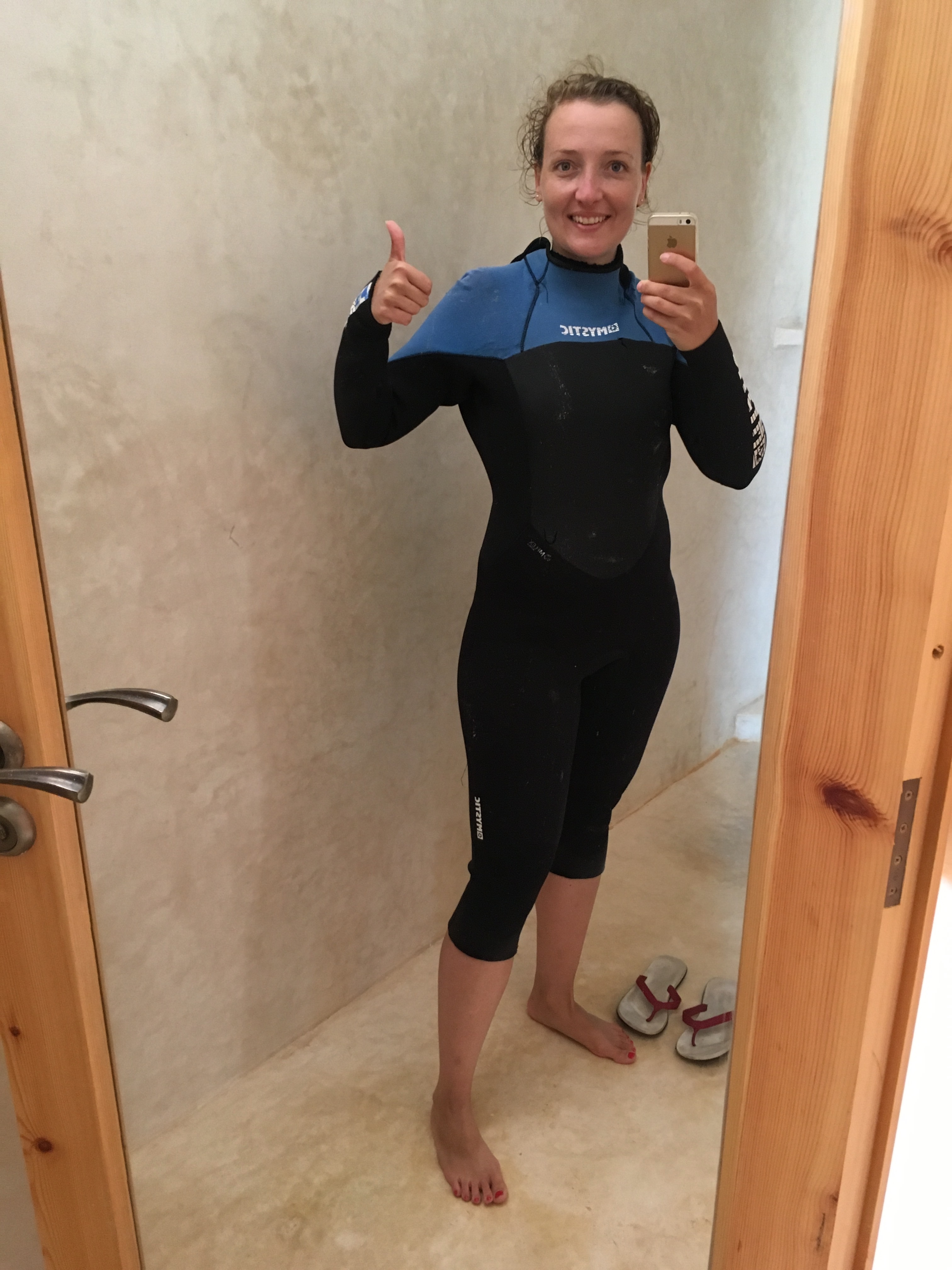 Pünktlich 10:30 Uhr stehe ich erwartungsvoll in meinem Neoprenanzug bereit. Und das war gar nicht so einfach. Bikini drunter und kurzes Eincremen zum Sonnenschutz…das ging superfix. Aber so ein Neo scheint einfach von Grund auf viel zu eng. In den muss man sich förmlich reinpellen. Aber gut, nur so kann er angeblich wirken. Nur so kommt einmal Wasser rein, das dann vom Körper angewärmt wird und vorm Frieren schützt.