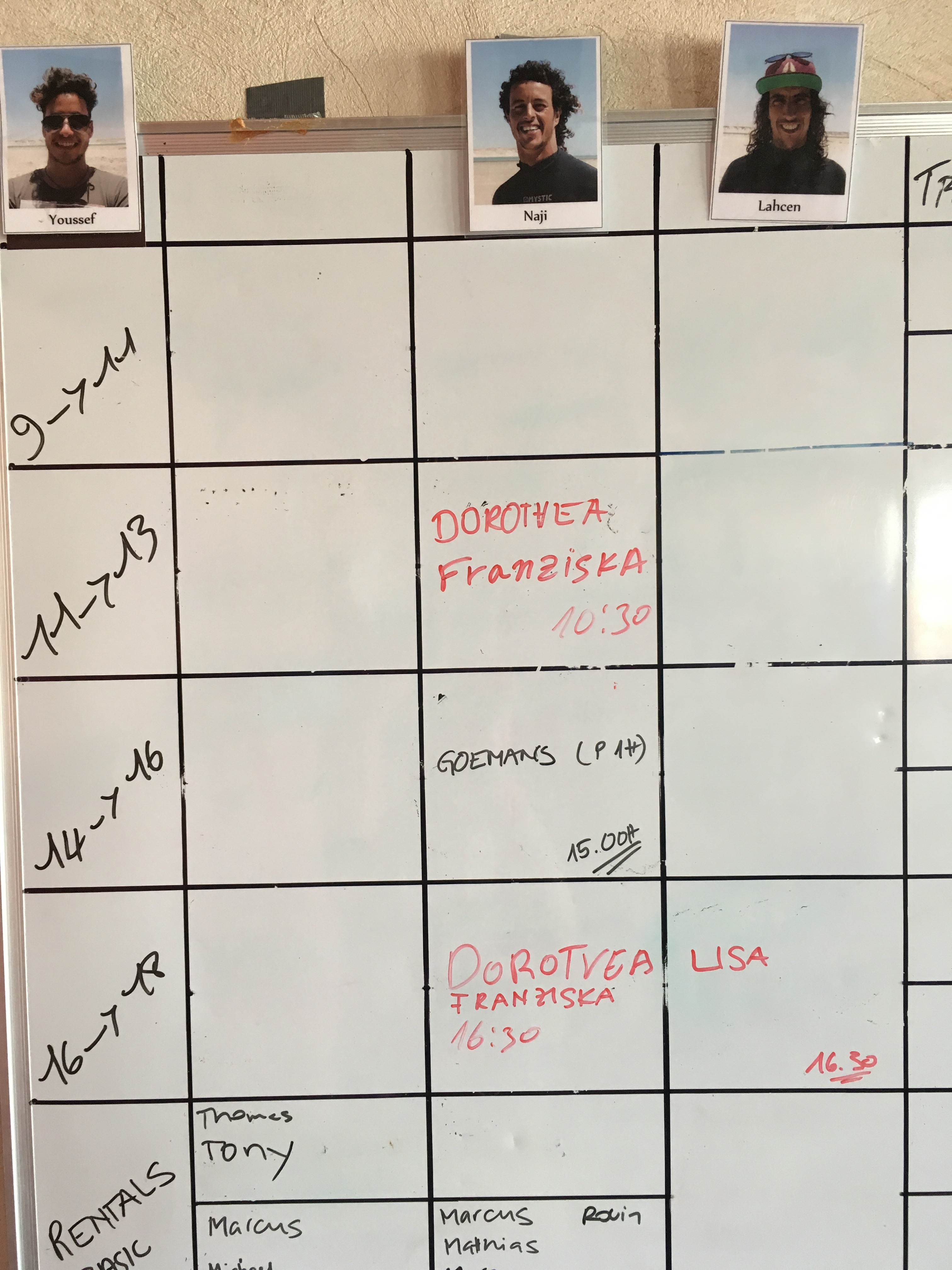 Nach dem Frühstück hat mich Michele, die superfreundliche Managerin der Kitestation, nicht nur mit Sonnencreme, Shampoo usw. ausgestattet sondern auch mit reichlich Info’s gefüttert und mir das passende Kite-Equipment zusammengestellt: ein langärmeliger Neoprenanzug, Helm, Weste und Trapez. Der Kite wird von Naji immer je nach Windverhältnissen ausgesucht.