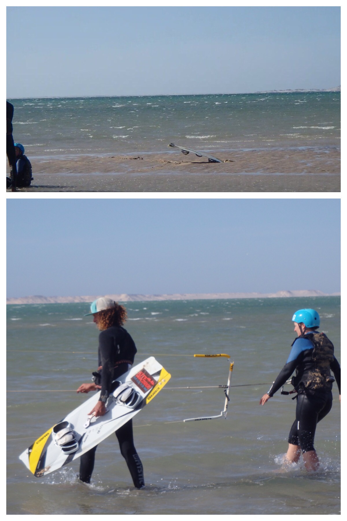 Nach ein/zwei einarmigen Übungsrunden und einer gefühlten halb verschluckten Lagune im Bauch, schickt mich Naji dann endlich aufs Brett. Und das gerade einmal an meinem zweiten Tag!!! Naji zeigt uns also, in welcher Reihenfolge wir unsere Füße aufs Board in die Schlaufen stecken, das Board unter den Kite-Leinen einfädeln und uns in Startposition bringen. Beide Beine nach vorn. Aber wichtig: das erste in Fahrtrichtung ausgestreckt, das hintere angewinkelt. Und sein bester Tipp: „Einfach versuchen aufzustehen, wenn der Kite dir die Chance dazu gibt“. Klar. Was auch immer Naji da genau mit meint, habe ich erst später wirklich verstanden.