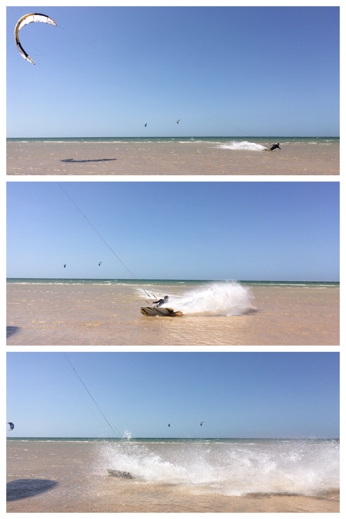Wie mir zu Anfang schön eingebläut wurde, behalte ich auch bei meiner letzten Nachmittagssession den Kite immer fest im Blick – egal, wie mich die Sonne auch blendet. Hochkonzentriert genieße ich aber endlich auch mal die Momente, in denen mir auf dem Brett der Wind um die Nase pfeift und ich ungehindert dahinschlitter. Doch, was war das? Plötzlich finde ich mich sitzend wieder. Der Kite sinkt zu Boden und mir brummt der Schädel. Was war da gerade passiert? Ein abrupter Purzelbaum! Naji meinte nur grinsend, ich solle doch auch die Umgebung im Blick behalten. Da hatte ich wohl, bei gehender Flut eine kommende Sandbank übersehen. Hier war das Flachwasser also einfach doch etwas zu flach! Das Brett steckt sogar noch einige Meter von mir entfernt fest. Doch Naji tut das einzig Richtige: Er schnappt sich mein Board, zwingt mich gleich wieder raus, den Schock abzuschütteln und einfach weiterzufahren.